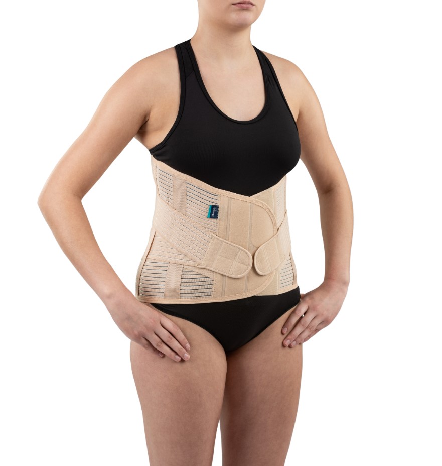 Orteza thoracolumbar-lumbar-sacrală înaltă (corset) – modelul TGO-R SLKP 703 este fabricată din țesătură elastică de compresie fixată în față cu Velcro, din oase de balenă flexibile, din oțeluri de aluminiu pentru reducerea presiunii și stabilizarea coloanei vertebrale și dintr-un sistem de curele de strângere care permite ajustarea forței de stabilizare.