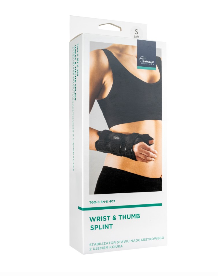Stabilizatorul pentru încheietura mâinii cu fixare pentru degetul mare este fabricat din material respirabil cu perforații și atele din aluminiu care stabilizează articulația încheieturii mâinii pe partea palmei și degetul mare pe partea laterală. Utilizarea curelelor de strângere circumferențiale asigură o fixare strânsă a stabilizatorului și o imobilizare sigură.
