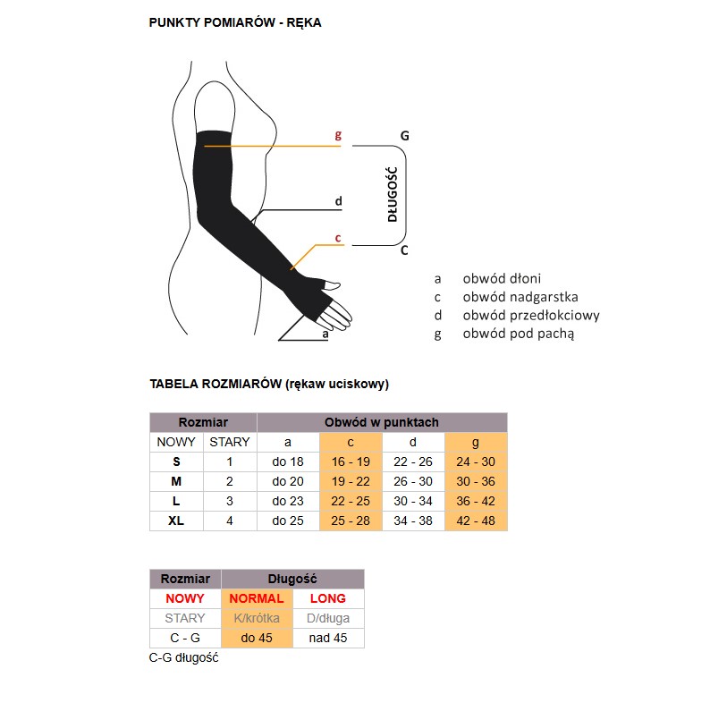 Măsurarea trebuie efectuată de preferință dimineața, deoarece membrele se umflă în timpul zilei, iar măsurătorile efectuate nu ar fi corecte. Măsurați circumferințele în toate punctele în conformitate cu diagrama de mărimi a produsului în cauză (poziționarea acestora pe membru este ilustrată în fotografii). La alegerea mărimii, valorile cheie sunt la punctele c (circumferința încheieturii mâinii) și g (circumferința axilei). La fel de importantă este și măsurarea lungimii mânecii între punctele c – g.